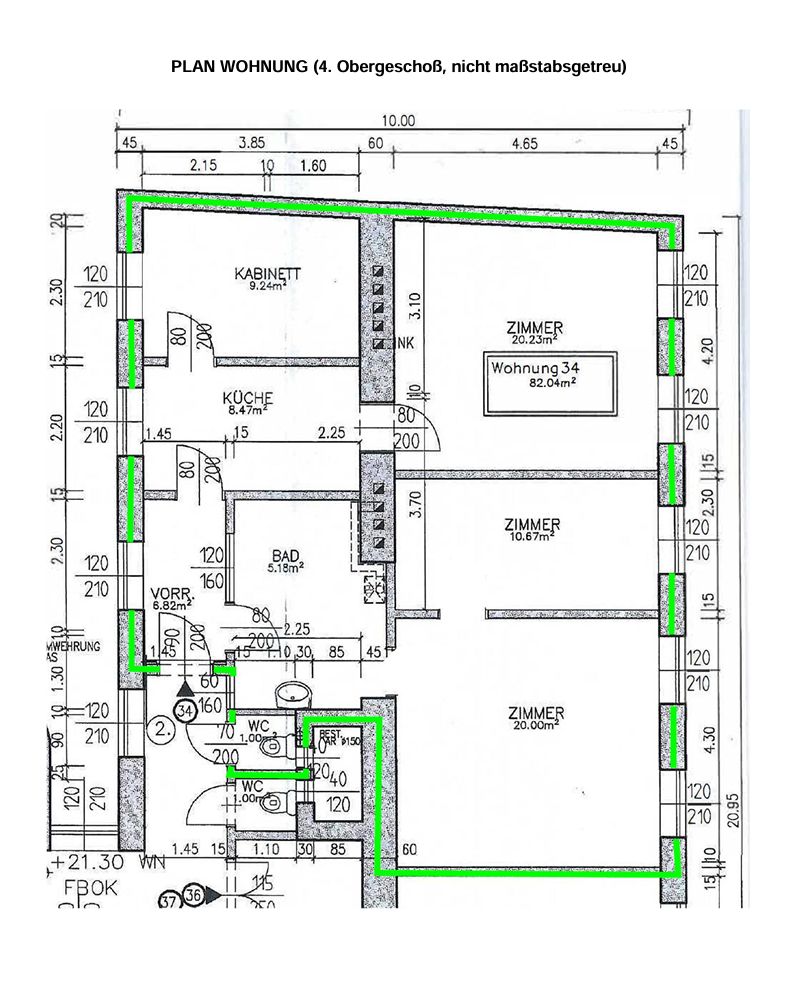 Raumaufteilung: Die ca. 79,93 m² (laut Vermessung durch die MA 40) bzw. 82,04 m² (laut Bestandsplan aus 1997) große Wohnung wird unmöbliert verkauft, hat eine Raumhöhe von 3,25m und teilt sich in Vorraum, Küche, 3 Zimmer, 1 Kabinett, Bad (mit Kleinbadewanne) und Gang WC (mit Fenster).