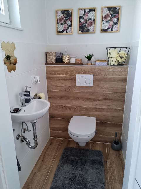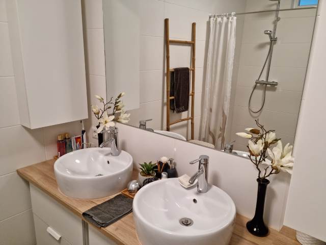 Doppelwaschbecken, Waschmaschinenanschluss und WC.