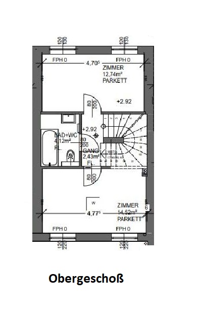 Obergeschoß: 2 getrennt begehbare Schlafzimmer, Badezimmer mit Wanne und WC