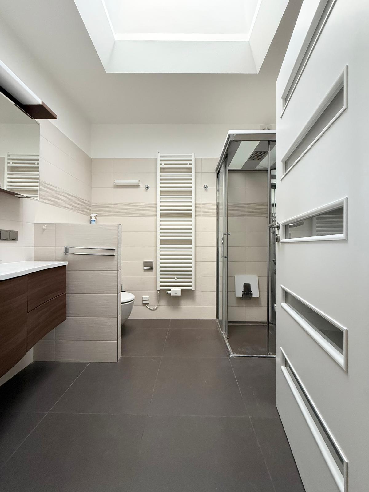 Diese gut aufgeteilte Dachgeschoßwohnung hat eine Wohnfläche von 94,03m² und teilt sich in Wohnküche, Schlafzimmer, zwei Kabinette, Bad mit Dampfdusche, WC, Waschmaschinenanschluss und Handtuchheizkörper, Vorraum und WC mit Handwaschbecken.